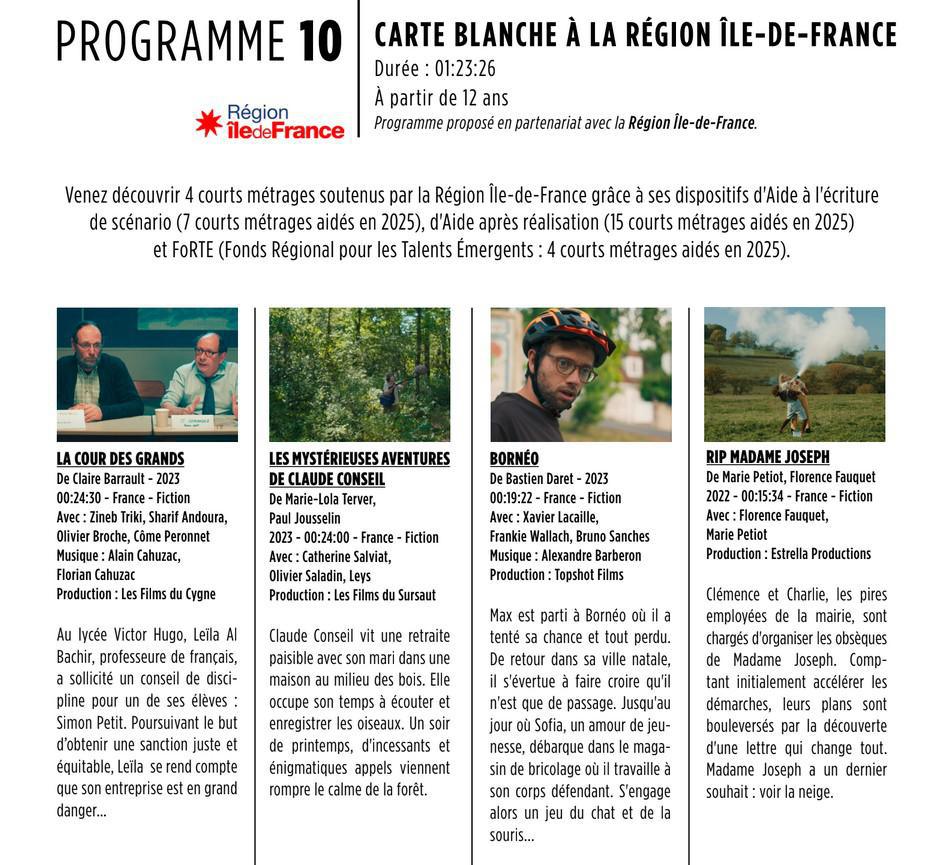 - Dimanche 29.03 17h CARTE BLANCHE À LA RÉGION ÎLE-DEFRANCE Venez découvrir 4 courts métrages soutenus par la Région Île-de-France grâce à ses dispositifs d'Aide. Gratuit